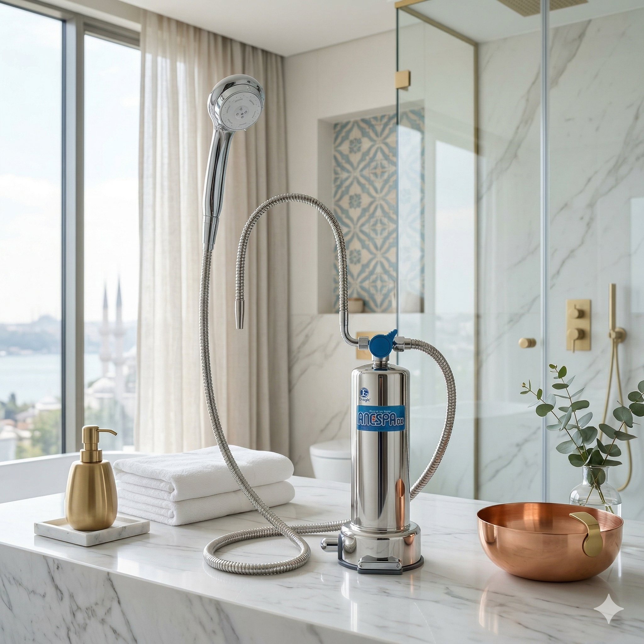Tired of harsh water ruining your skin and hair? Upgrade your daily shower with the ANESPA DX, a spa system that removes chlorine and infuses water with relaxing, beneficial Japanese hot spring minerals for unparalleled softness and luxury. Don't wait any longer to transform your Turkish bathroom into a personal home spa and experience healthier hydration from head to toe—secure yours now!